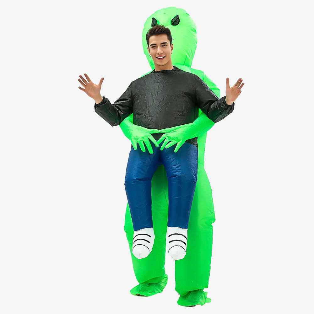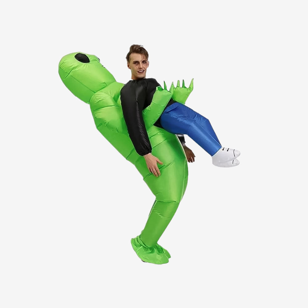 Déguisement gonflable alien qui enlève un humain. Effet hilarant, installation rapide et confort garanti pour Halloween, soirées et festivals.