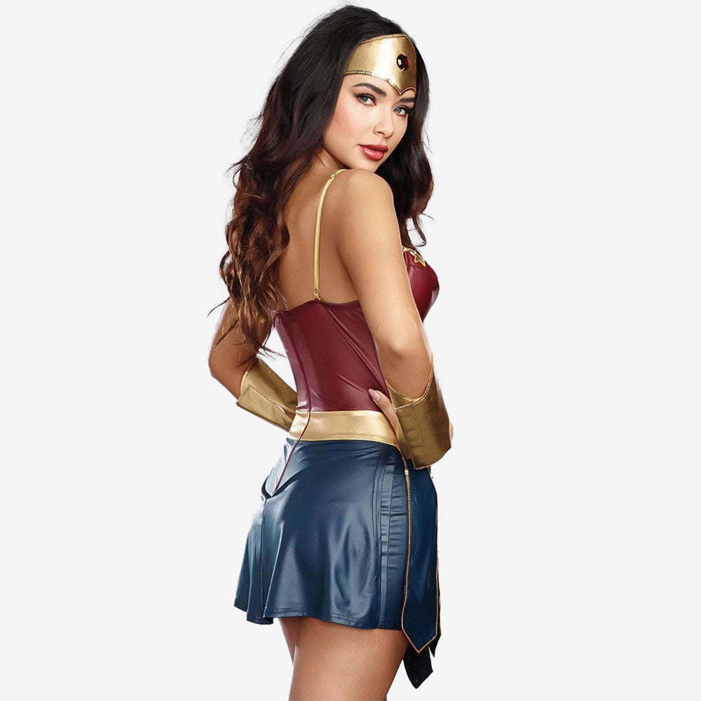 Costume femme inspiré de Wonder Woman, idéal pour soirées et cosplay. Tenue complète avec corset rouge, jupe bleue et accessoires dorés inclus. Matière douce, légère et extensible pour un confort durable. Une allure puissante et élégante pour révéler votre héroïne intérieure.