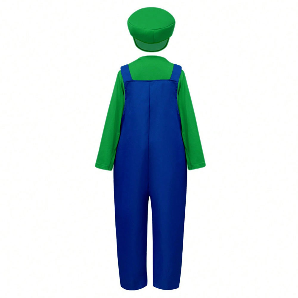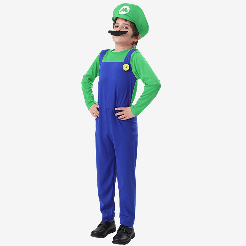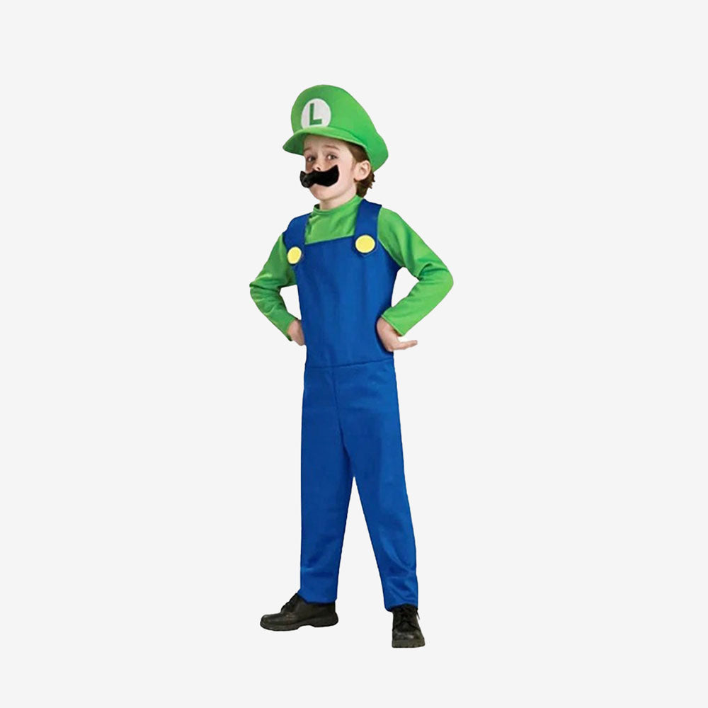 Déguisement luigi enfant complet vert et bleu avec salopette, haut, casquette, moustache et gants inclus. Confortable, léger et facile à enfiler pour toutes les fêtes et carnavals.