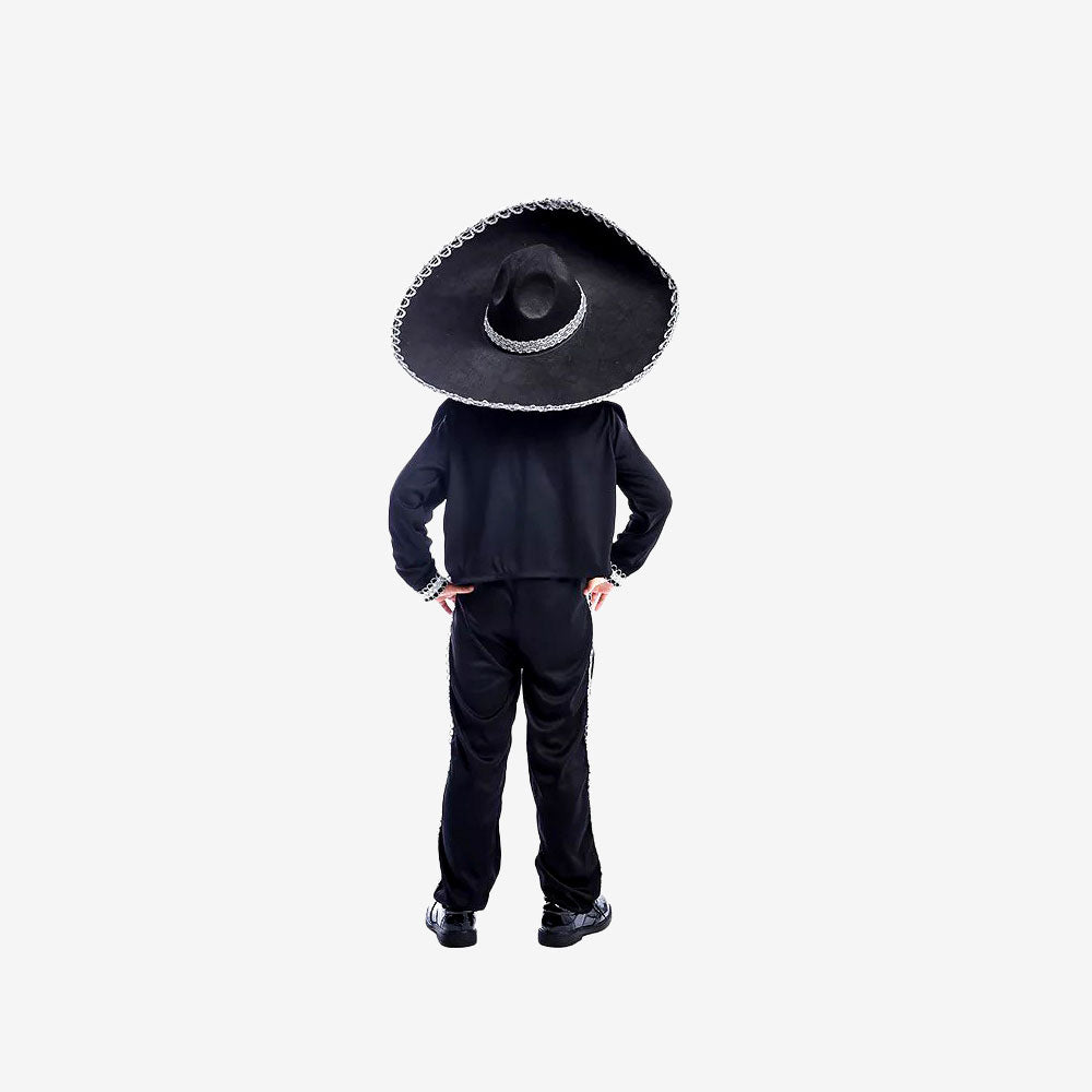 Déguisement Mariachi enfant avec veste, pantalon, sombrero, nœud papillon et ceinture-écharpe inclus. Costume festif et authentique idéal pour carnaval, fête ou spectacle.