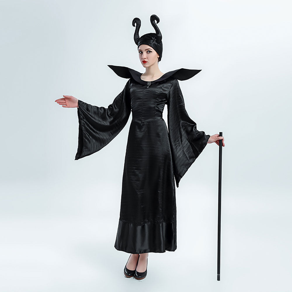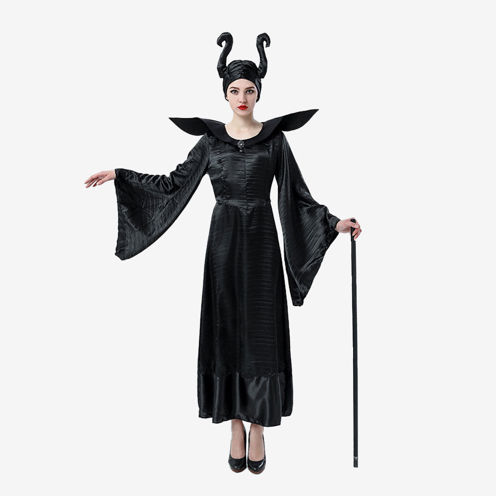 Costume femme inspiré de l’univers de Maléfique. Comprend la robe longue noire à manches évasées, la coiffe à cornes et le sceptre assorti. Tissu fluide effet velours, agréable à porter et spectaculaire pour Halloween, Carnaval ou une soirée déguisée. Facile à enfiler, élégant et disponible en plusieurs tailles.