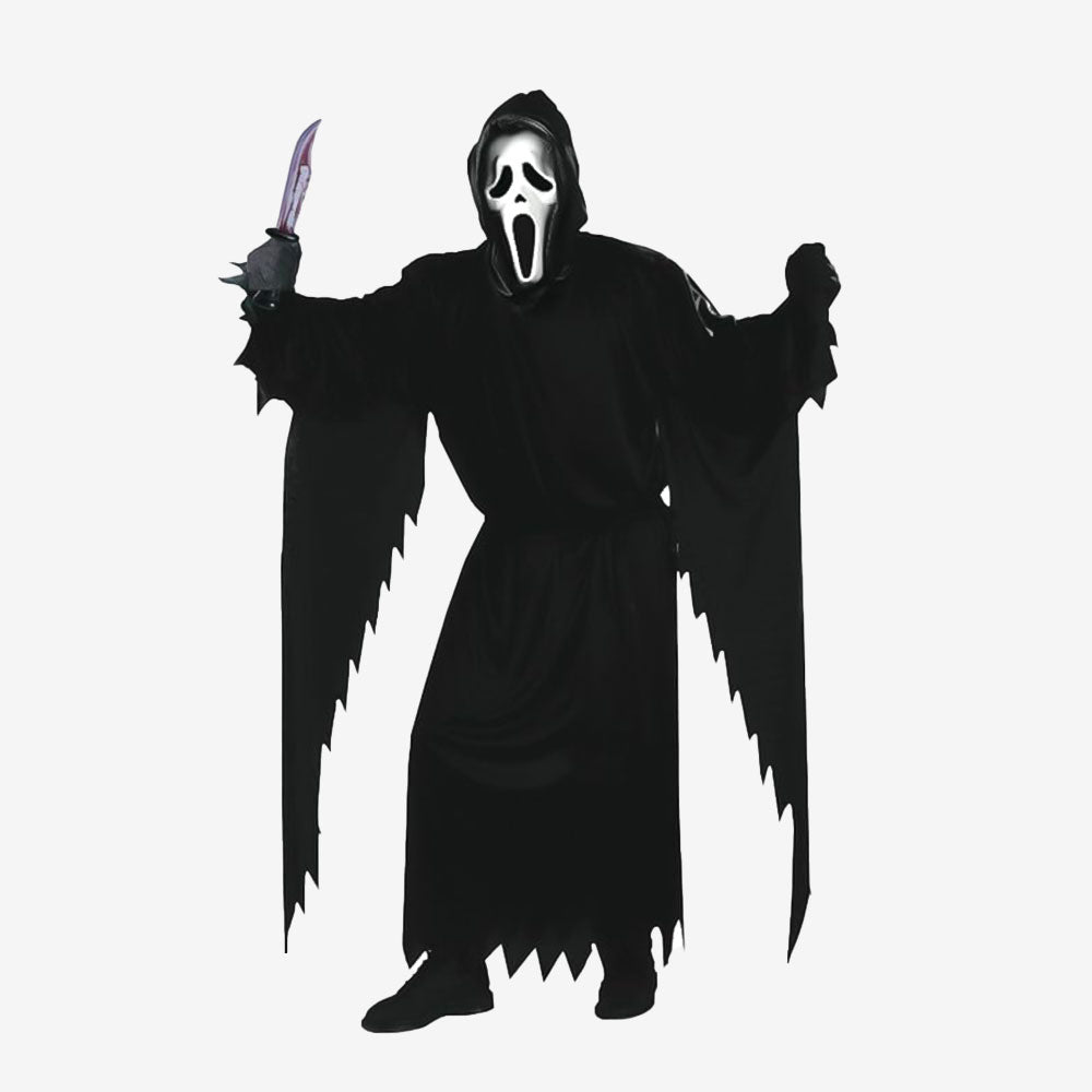 Costume enfant complet inspiré de Scream. Comprend la tunique noire à capuche, le masque, les gants et un couteau factice. Tissu fluide, coupe ample et confort idéal pour Halloween ou une fête costumée. Disponible en plusieurs tailles pour enfants.
